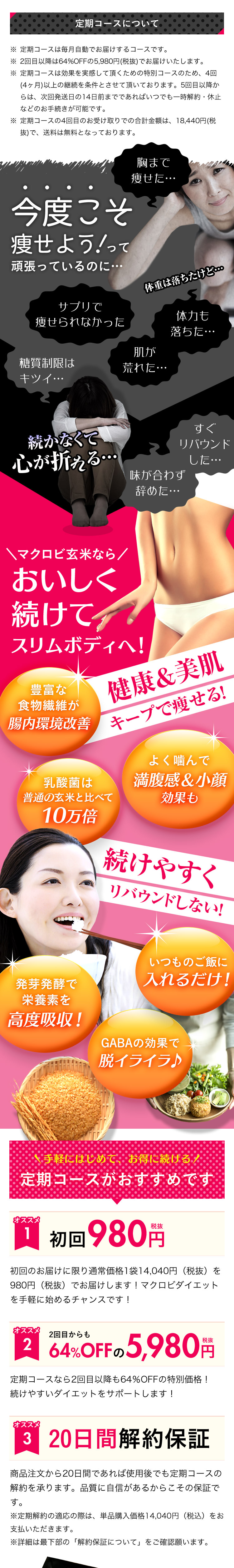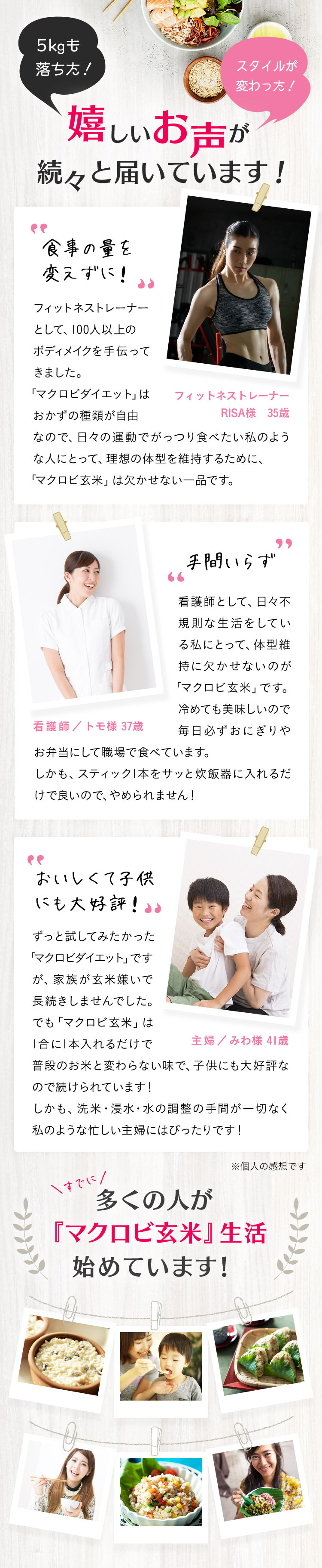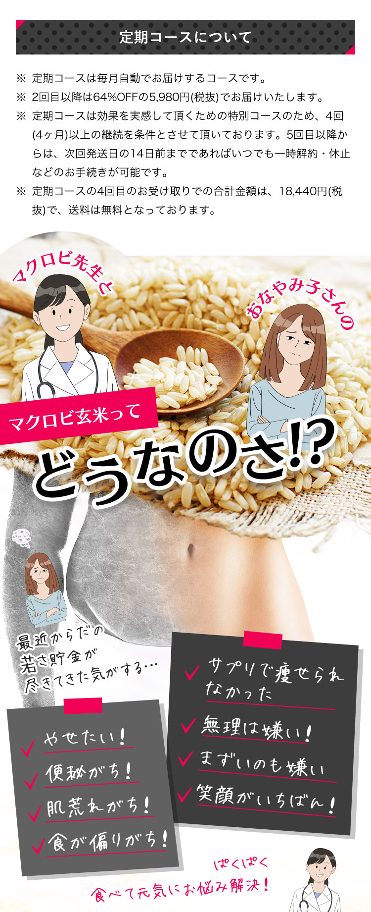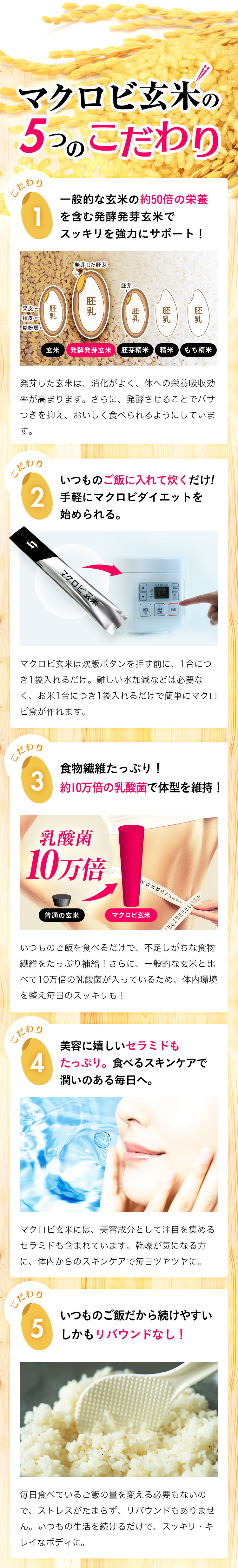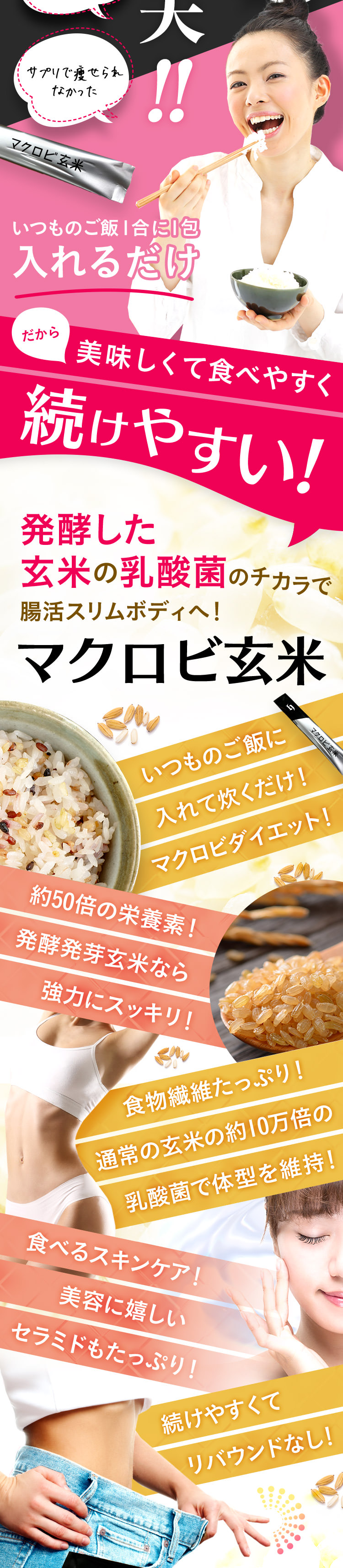 - 「マクロビダイエット」とは、玄米を中心にバランスの良い食生活にすることで、食事の量を変えずに、リバウンドしない理想的な身体を維持できるダイエット方法のことで、「マクロビ玄米」はマクロビダイエットを始める手助けをします。